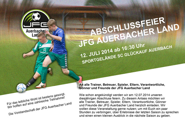 Wie schon angekündigt werden wir am 12. juli 2014 ab 16:30 Uhr unseren diesjährigen Abschluss feiern. Zu diesem Anlass möchten wir alle Trainer, Betreuer, Spieler, Eltern, Verantwortliche, Gönner und Freunde der JFG Auerbacher Land herzlich einladen.