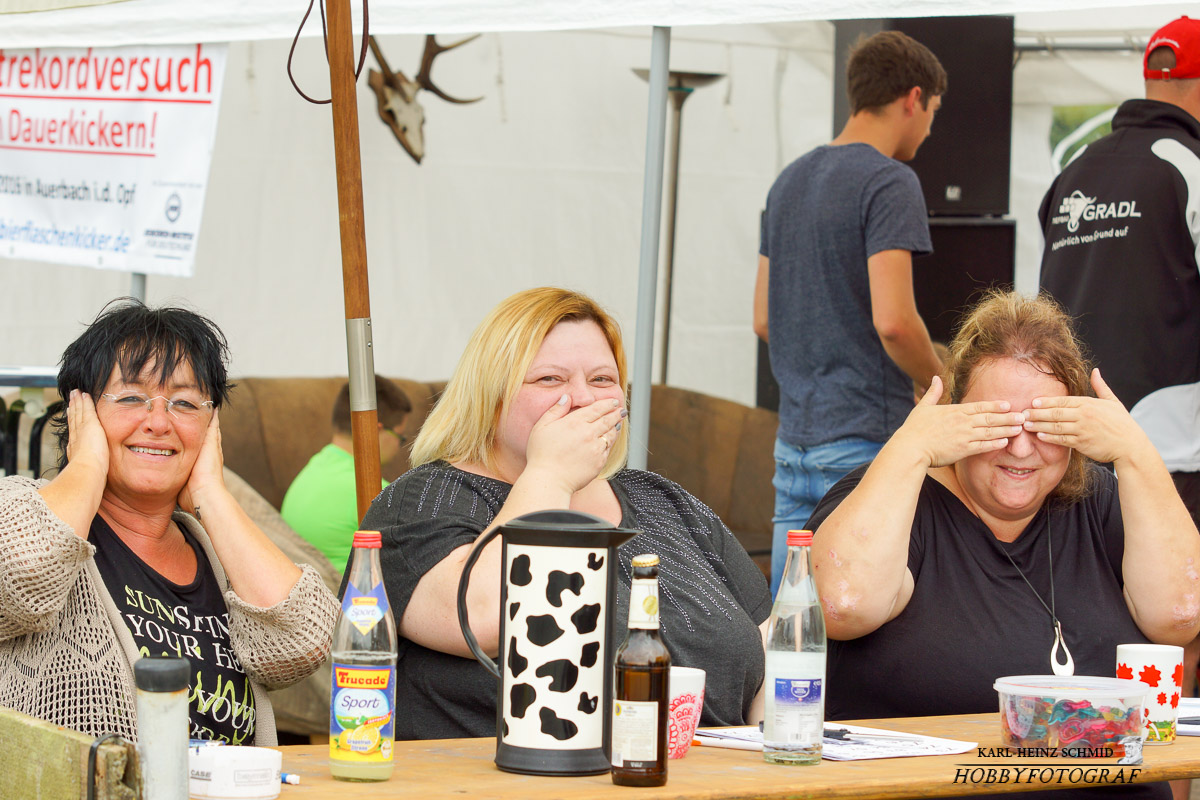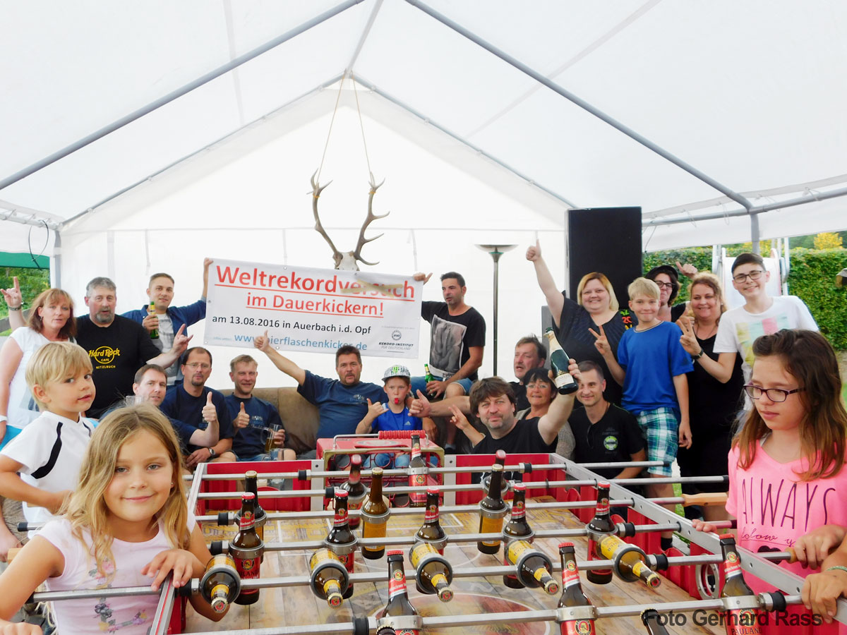 Dank der vielen begeisterten Mitspieler aus ganz Deutschland (unter anderem aus Cham, Hamburg, Pirmasens, Münster, Kronach) haben wir den Weltrekord im Dauerkickern aufgestellt. Beginn war Samstag am 13.08.16 um 10 Uhr auf dem Sportgelände des SC Auerbach i.d.Opf. Die Marke mit 250 Spielern haben wir um 19.40 Uhr erreicht.